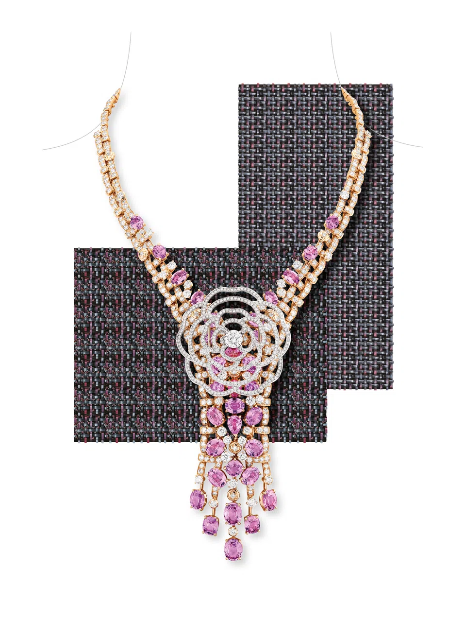 The Camellia, meanwhile, is an icon in Mademoiselle Chanel’s style for the liberated woman, and also a symbol of delicacy and distinction. Playing on transparencies and contrasts, the flower’s geometrical perfection is etched in rose gold embroideries set with powder-pink and fuchsia sapphires and spinels against a textured weave.