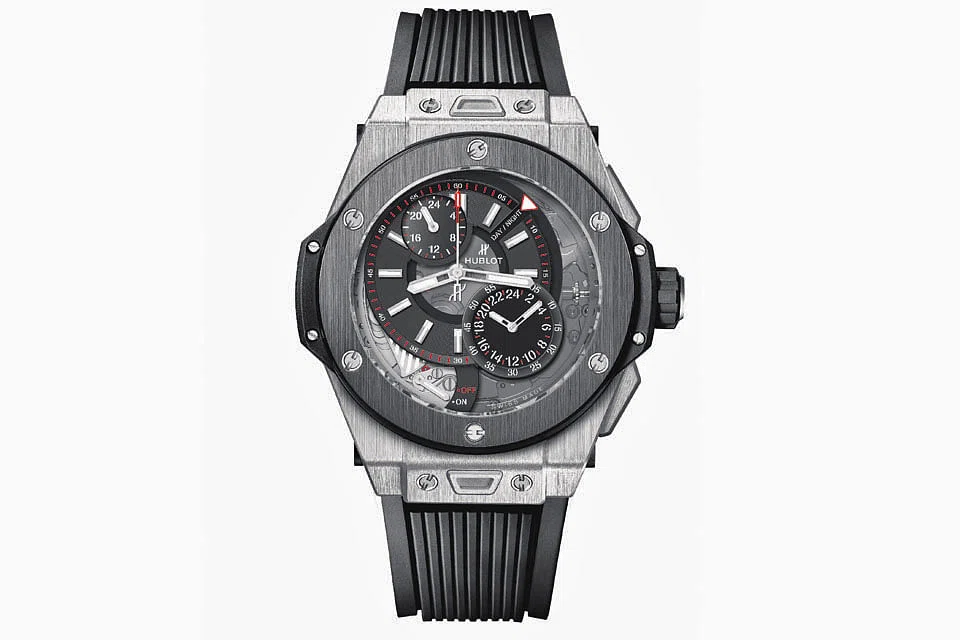 HUBLOT'S Big Bang Alarm Repeater chimes the programmed alarm time. This alarm time is set with the crown and is indicated by the counter located between the 4 o'clock and 5 o'clock position.