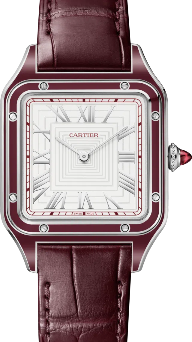 Customary at Cartier, the platinum model on burgundy leather, limited to just 150 pieces, comes with a red railroad minutes track and ruby cabochon.