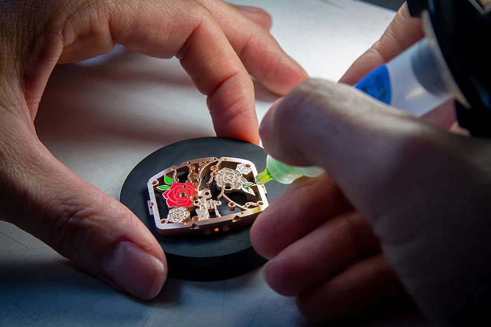 Serving as bridges and plates, the rose petals strengthen the structural integrity of the entire watch movement, which has been endured with luxe treatments such as satin finishing, circular graining and hand-chamfering.