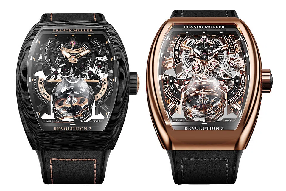 The 2 tourbillons appeared one each in 2 of the brand's key collections for the first time. The Vanguard Revolution 3 Tourbillon, a three-axis gravity defying mechanism far more spectacular and superior than the original single-axis tourbillon, is now at home in the Vanguard family, which is a showcase of Franck Muller's greatest creations.
