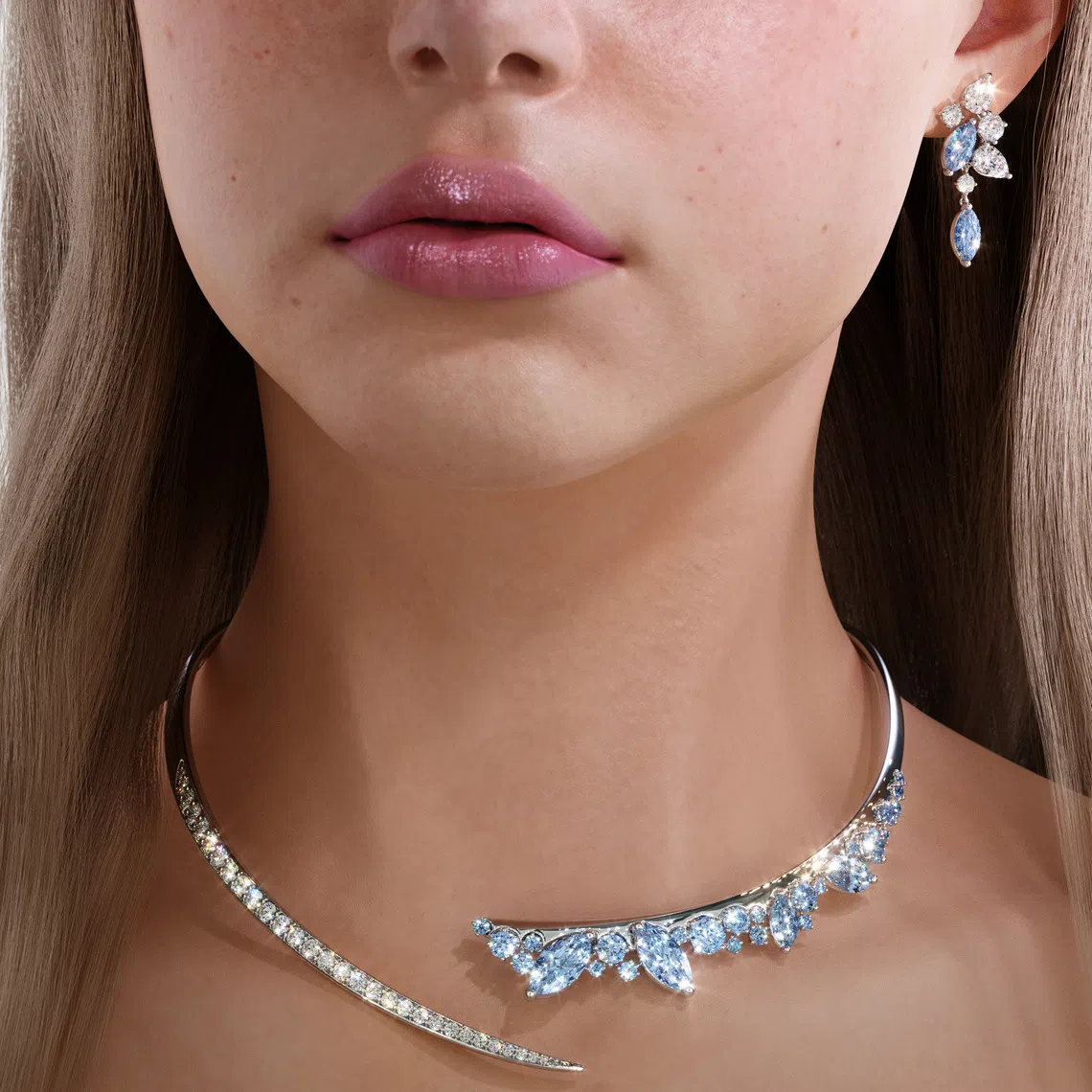 This bridal collection features JannPaul’s White Series Marquise X diamonds on a necklace and matching earrings. The blue in these LGDs is pure and vivid, without any grey or green overtones. The collar-style necklace is adorned with a cascading arrangement of marquise and round-cut blue diamonds on one end, and a sleek, curved band of pave-set diamonds on the other. This necklace-and-earrings set is priced from S$19,700.