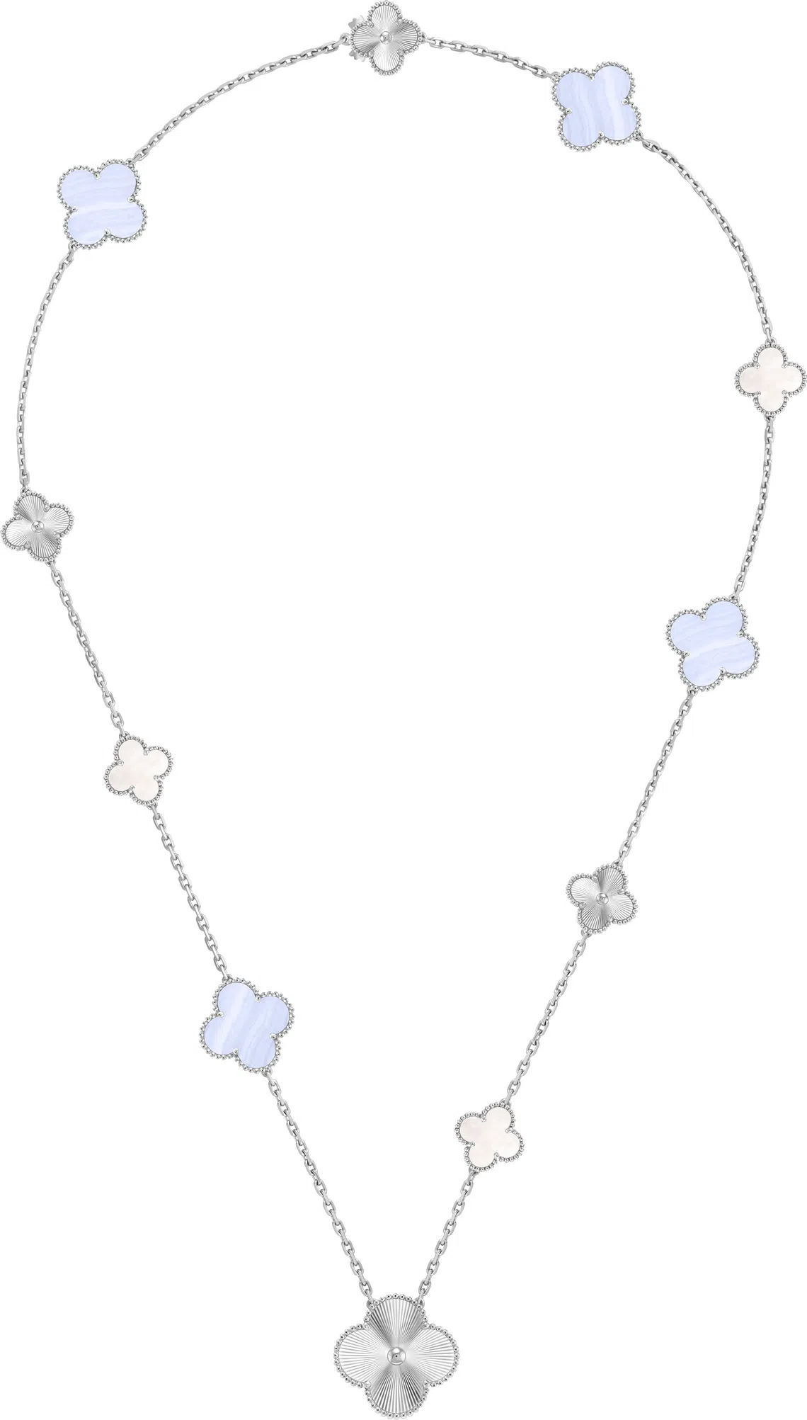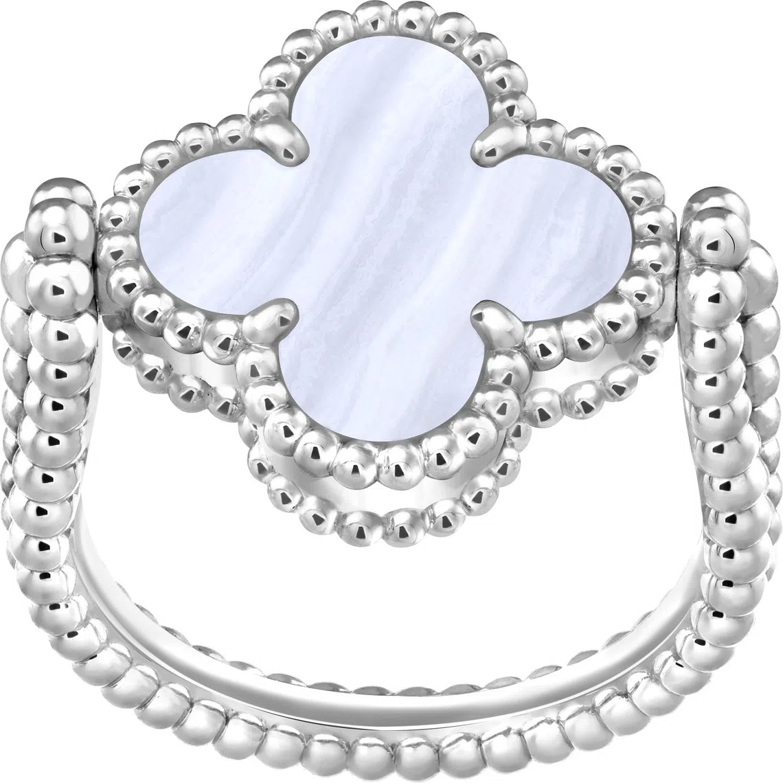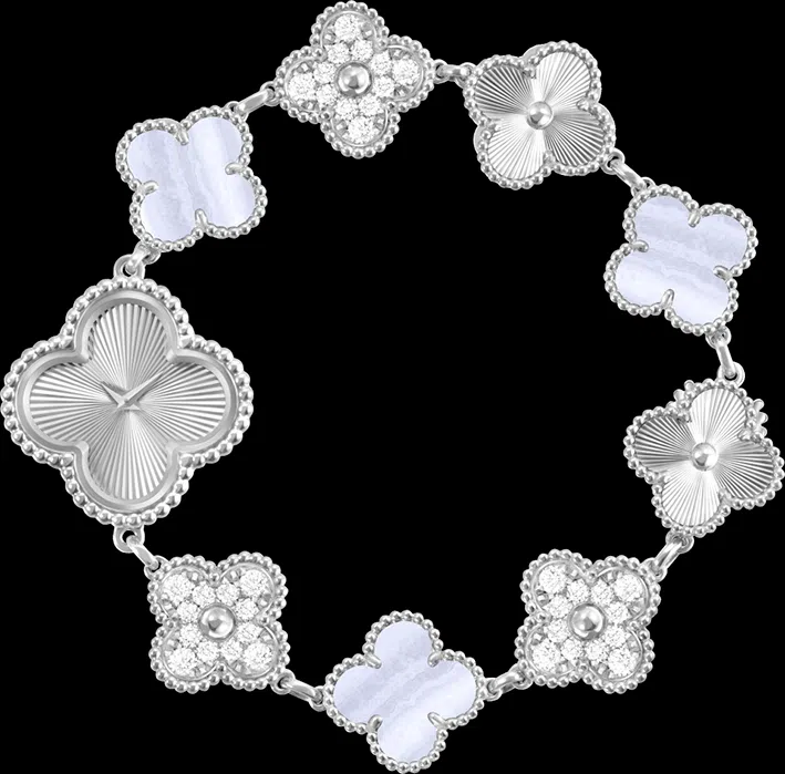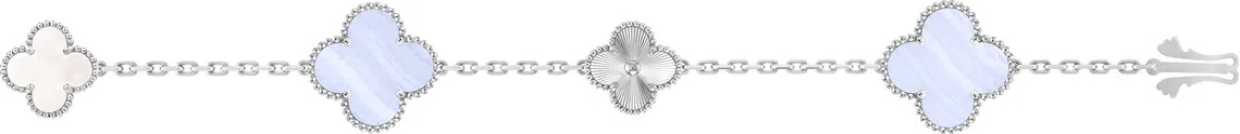 Not only that, they also come in two elegant colour combinations featuring ornamental stones and organic materials in the unmistakable Alhambra beaded contour. On one, the softness of rose gold sets off the iridescence of white and grey mother-of-pearl. On the other, pale blue chalcedony and lustrous white mother-of-pearl sit in the strength and brilliance of white gold.