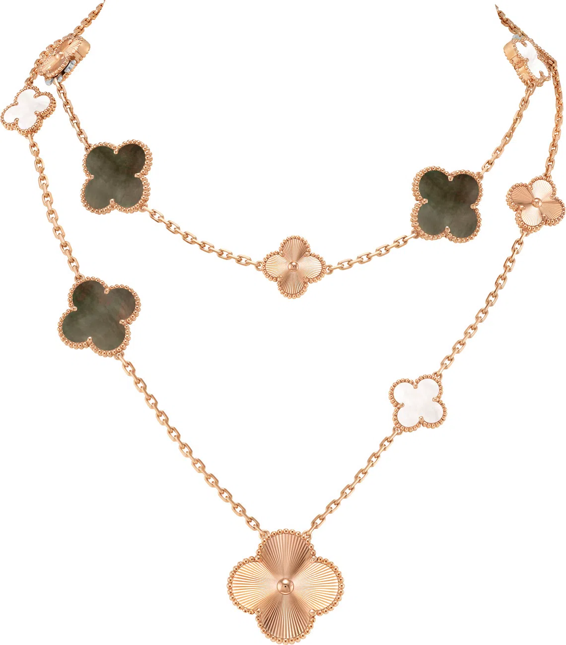 This season’s Alhambra pieces comprise two new long necklaces, two reversible rings and a watch.