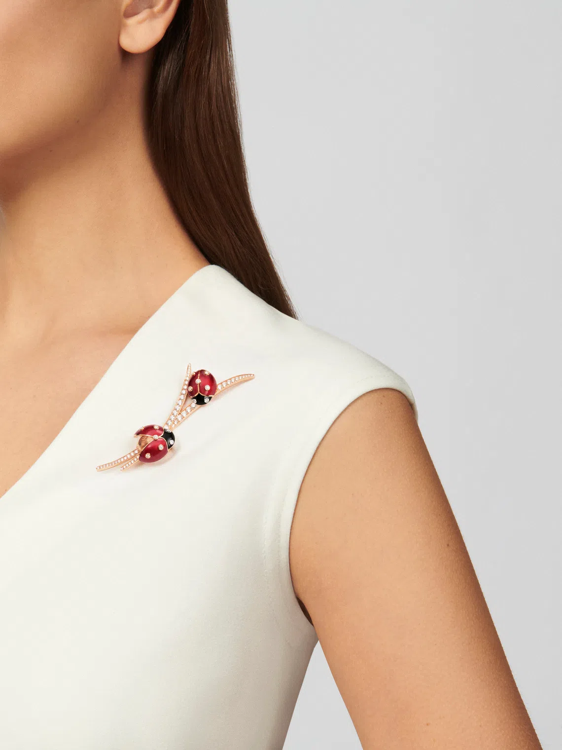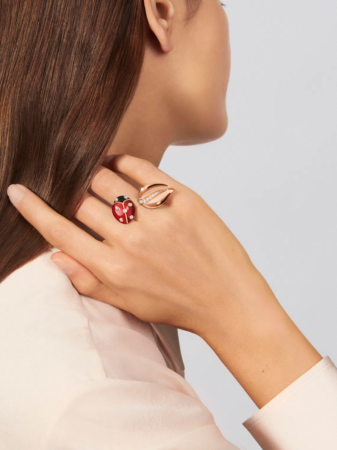 Appearing on a rose gold between-the-finger ring as well as a clip, they involve craftsmen carefully blending silica powder and pigments and applying them to the ladybirds’ dome-shaped, hollow golden wings before firing in a high-temperature oven. This process is repeated several times, so the motif takes on a deep vibrant red before a polishing process brings it to a glossy finish.