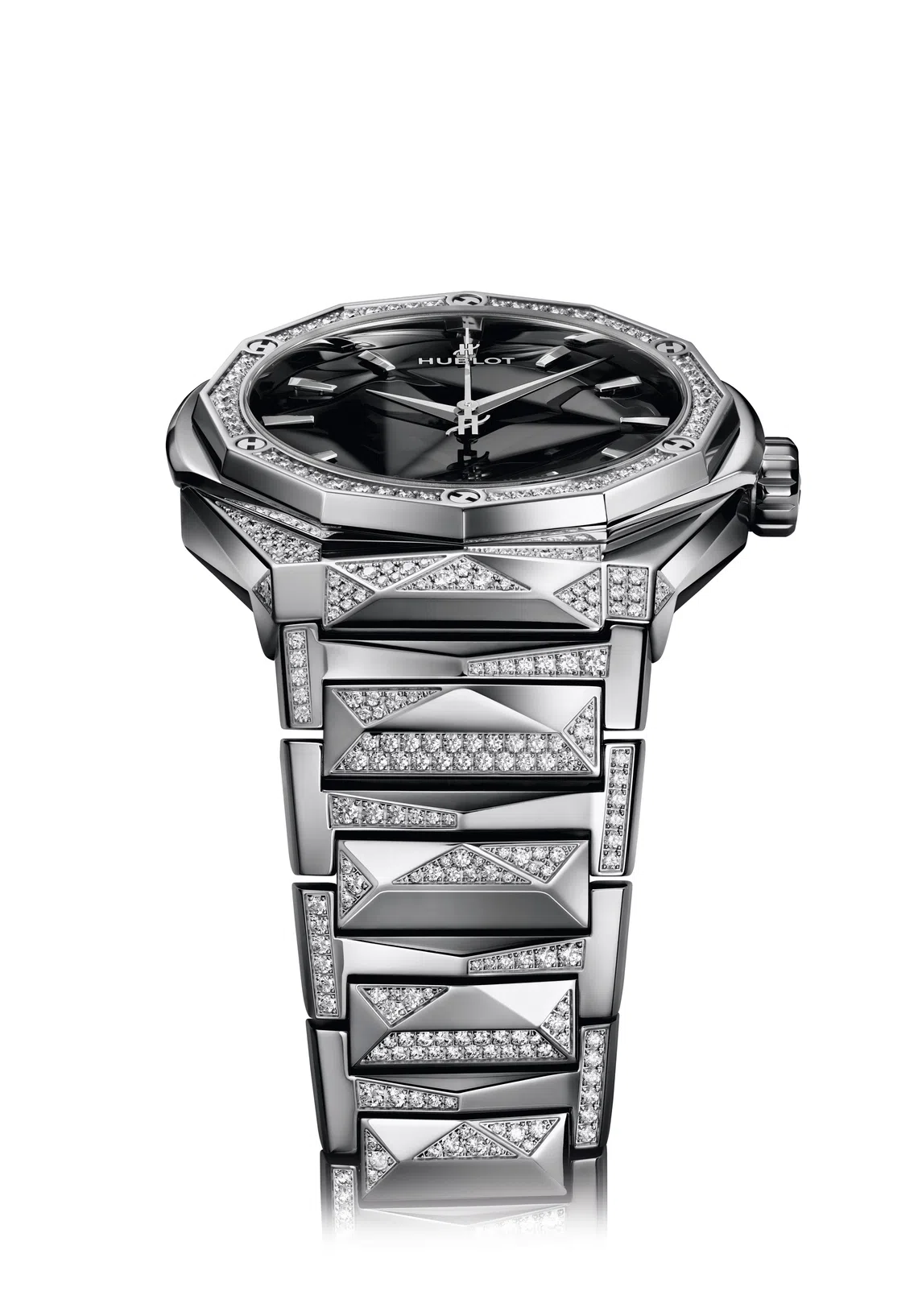 Watches with an integrated metallic bracelet are in vogue. Hublot has upped the game by collaborating with Richard Orlinski, the bestselling contemporary French artist in the world, to create its own version. It’s a tremendous challenge, especially in designing an integrated bracelet. The task for Hublot’s watchmakers and engineers was even more complex. The bracelet they produced is a metallic link whose architecture is bevelled and faceted in titanium and composed of 83 parts. This is attached to a timepiece “whose corners, bevelled edges and facet define the character of the case, bevel, crown”.