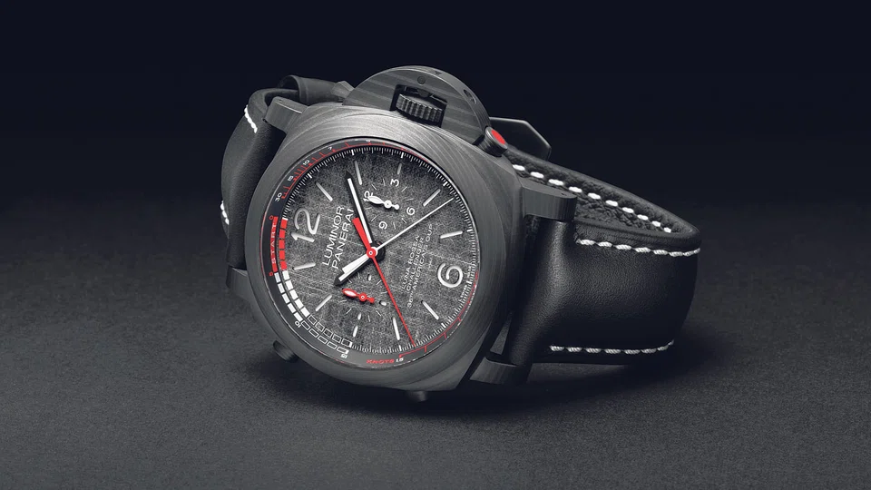 Along with a flyback chronograph and a GMT, the dark grey Regatta pre-start countdown watch complies with the new colour code of Luna Rosa, the Italian team of the America's Cup yacht race. Panerai is official sponsor of the team and its official watch. All three Luna Rossa models are designed to be used in yacht races. The colour complements its materials: Carbotech - a composite material based on carbon fibre - and titanium. These are materials that make the watches light but tough. The Luminor Luna Rossa Regatta, which is equipped with a selfwinding movement, also has a flyback chronograph function.