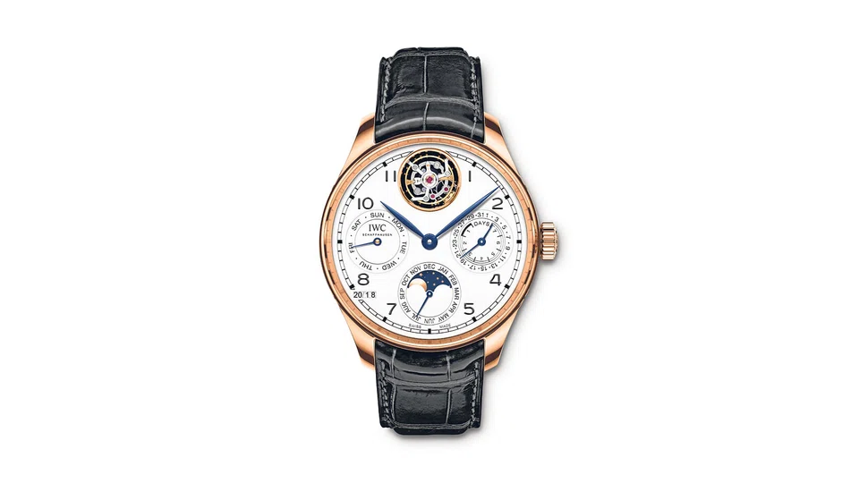 Five limited-edition Portugieser wristwatches were unveiled in the Jubilee collection. There's the technically sophisticated Portugieser Constant-Force Tourbillion Edition "150 Years" (15 pieces), which combines a constant-force tourbillon with a simple moon phase display - an IWC first.