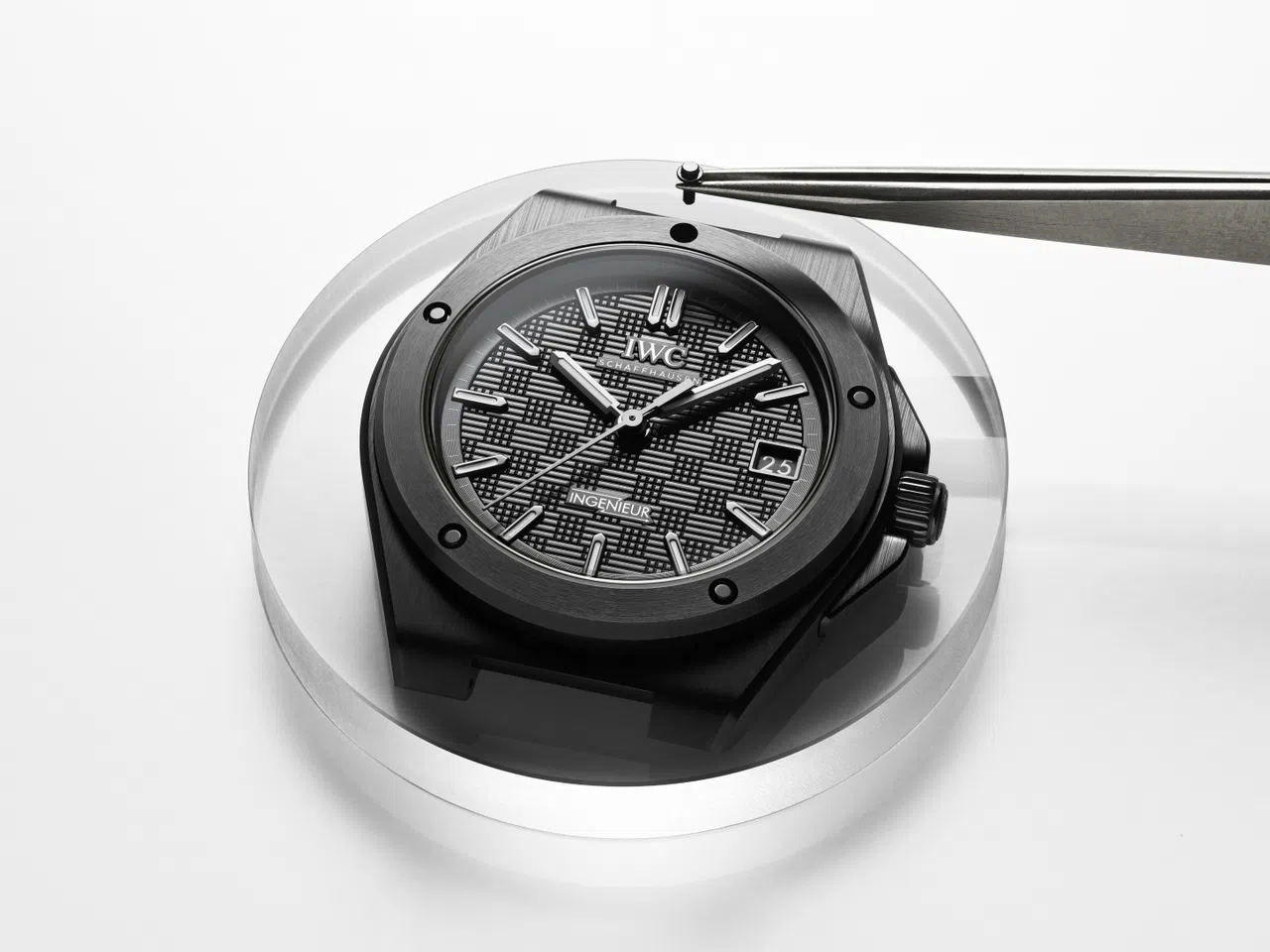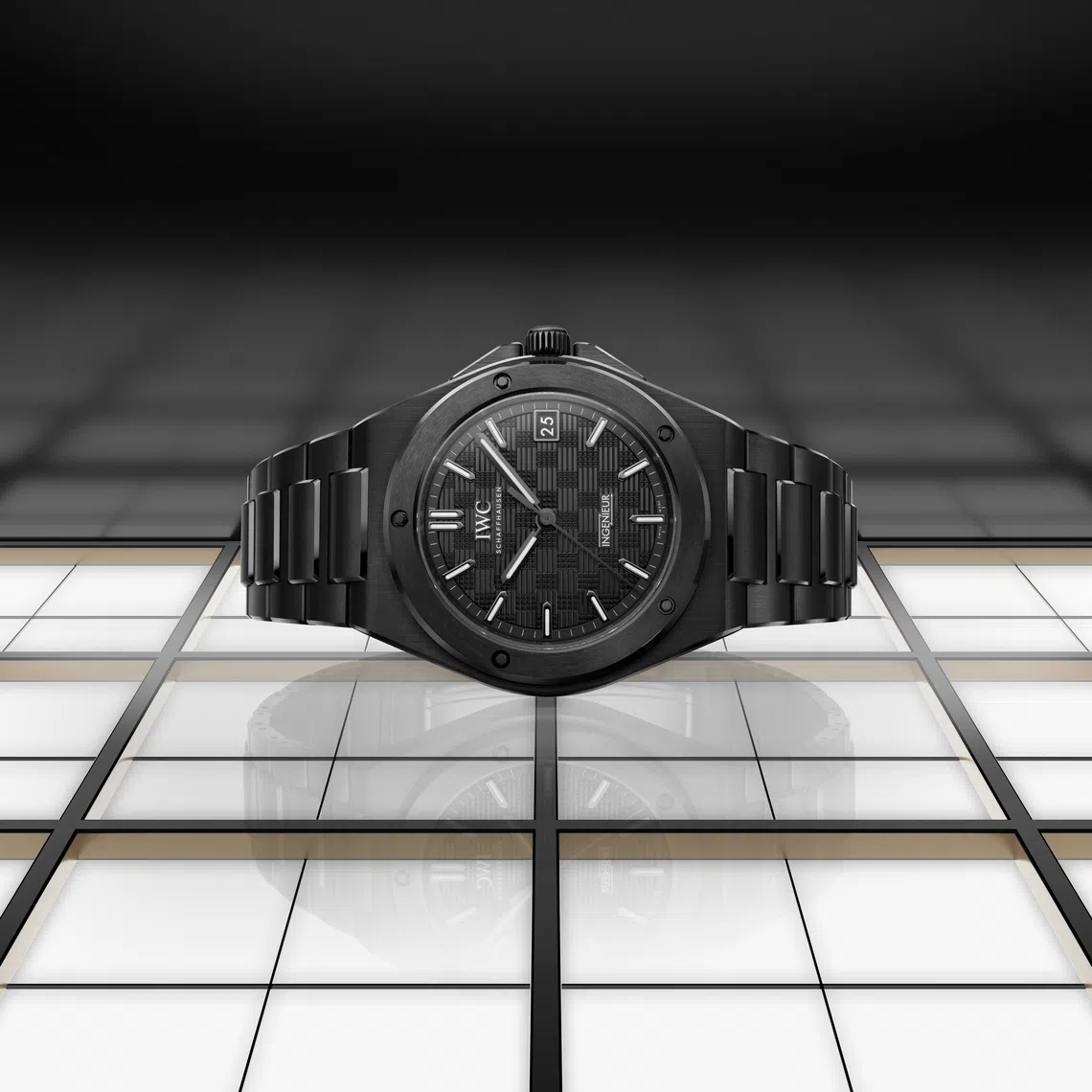 This complex, multi-stage finishing results in a refined aesthetic, offering perfect light play against the black surfaces. The monochrome dial continues the theme with the Ingenieur’s grid pattern, while blackened hands and markers filled with Super-LumiNova preserve low-light visibility.