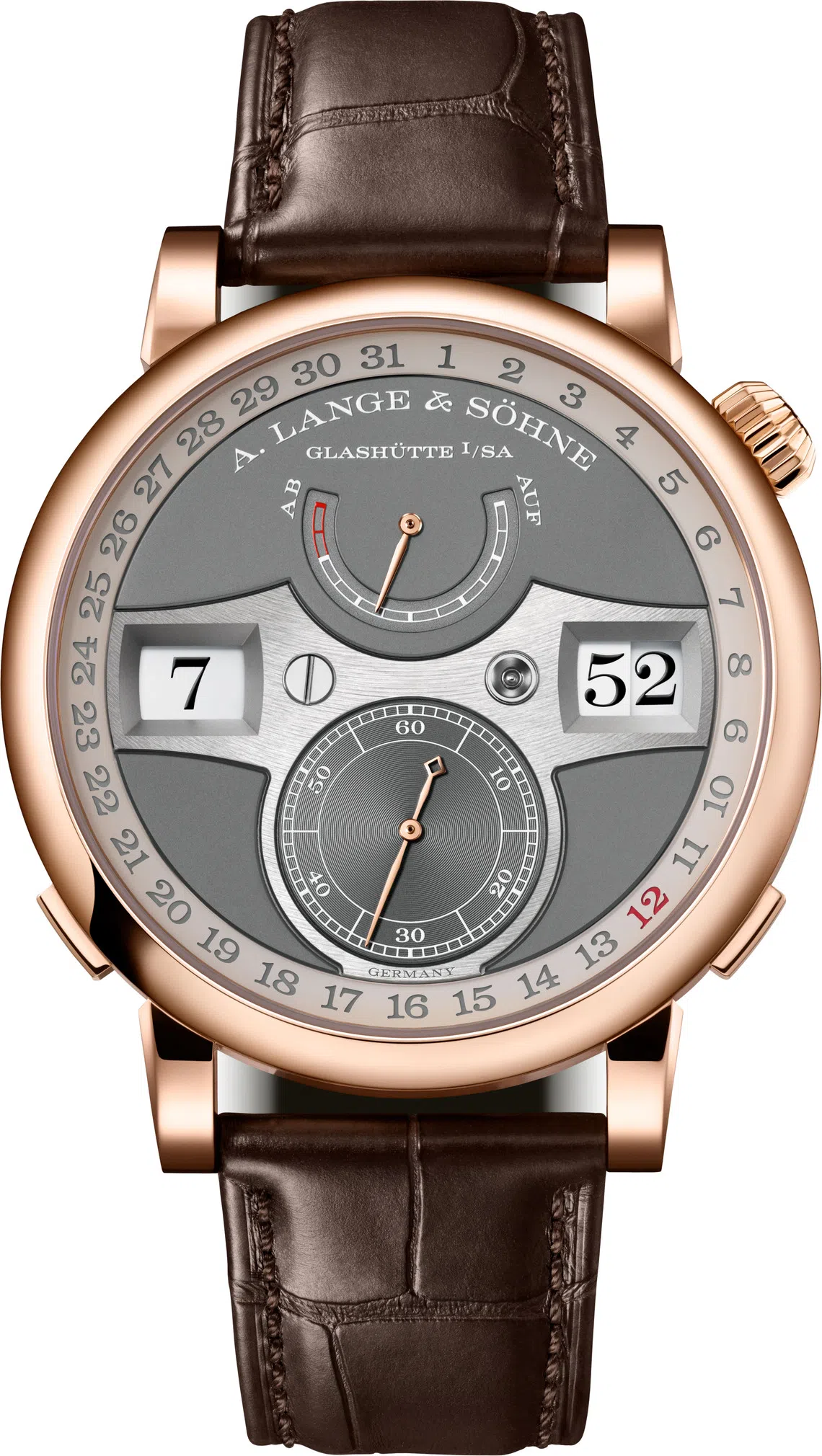 Based on a jumping numerals mechanism with a precisely jumping digital display, the Zeitwerk, launched in 2009, has expanded its line to models that are luminous, indicate the time acoustically, and show the date as well.