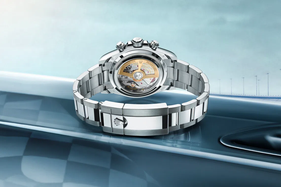 The standout feature of the centennial edition is the “100” red ceramic number on the tachymetric scale. A transparent case-back – the second in the Oyster Perpetual collection – reveals the movement with an oscillating weight, in 18-karat yellow gold like the new platinum model.