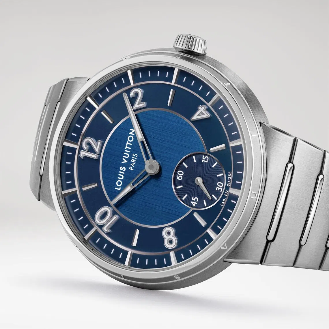 Instead, “Louis Vuitton Paris” is featured at the centre, under the small seconds display. “Fab en Suisse” (short for Fabrique en Suisse) replaces the traditional “Swiss Made” insignia, alluding to the brand’s 1950s and 1960s dials.