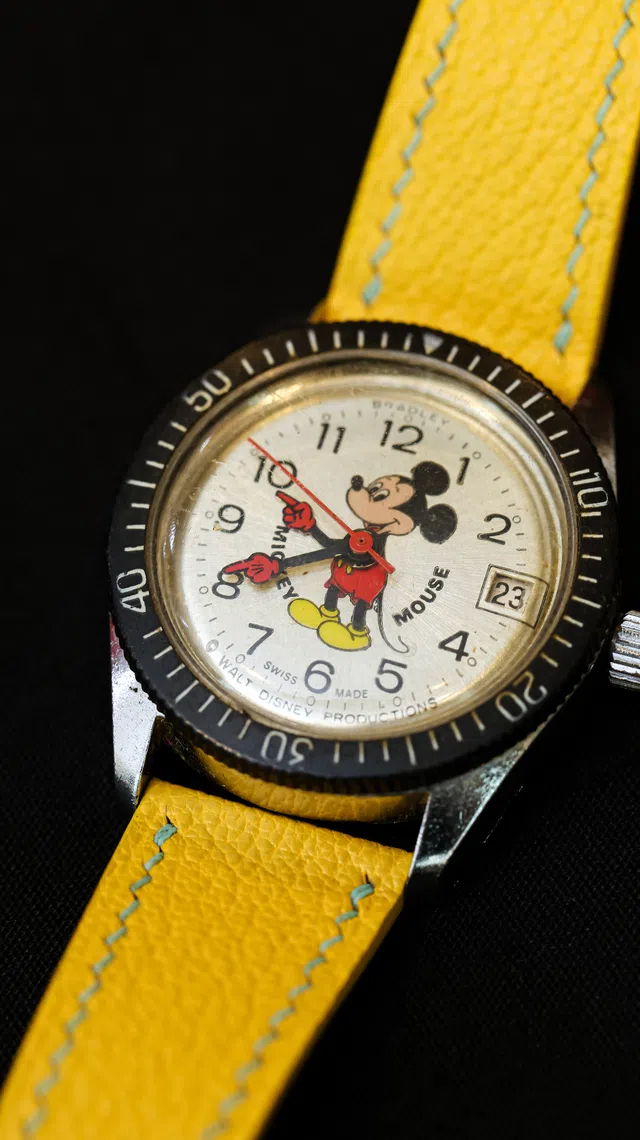 The self-winding Bradley watch, with Mickey Mouse on its face and yellow leather straps, was given to her by her father for her fifth birthday. The Mickey Mouse fan says: “I think he chose this one for me because it didn’t require batteries.”