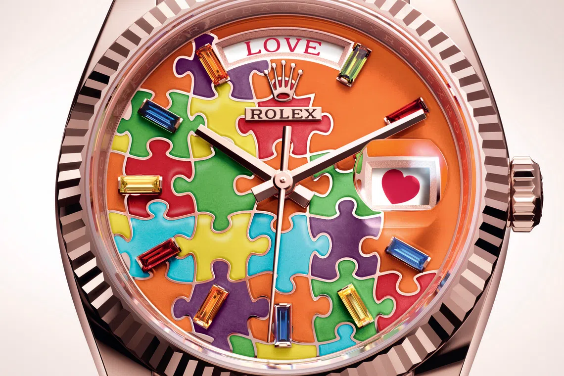 But the most whimsical of all has to be the Day-Date 36 with the jigsaw puzzle design on its dial, baguette-cut sapphires as hour markers, inspirational keywords in the 12 o’clock aperture, and emojis in the date window. The jigsaw puzzle motif is rendered using the painstaking technique of champleve enamelling.