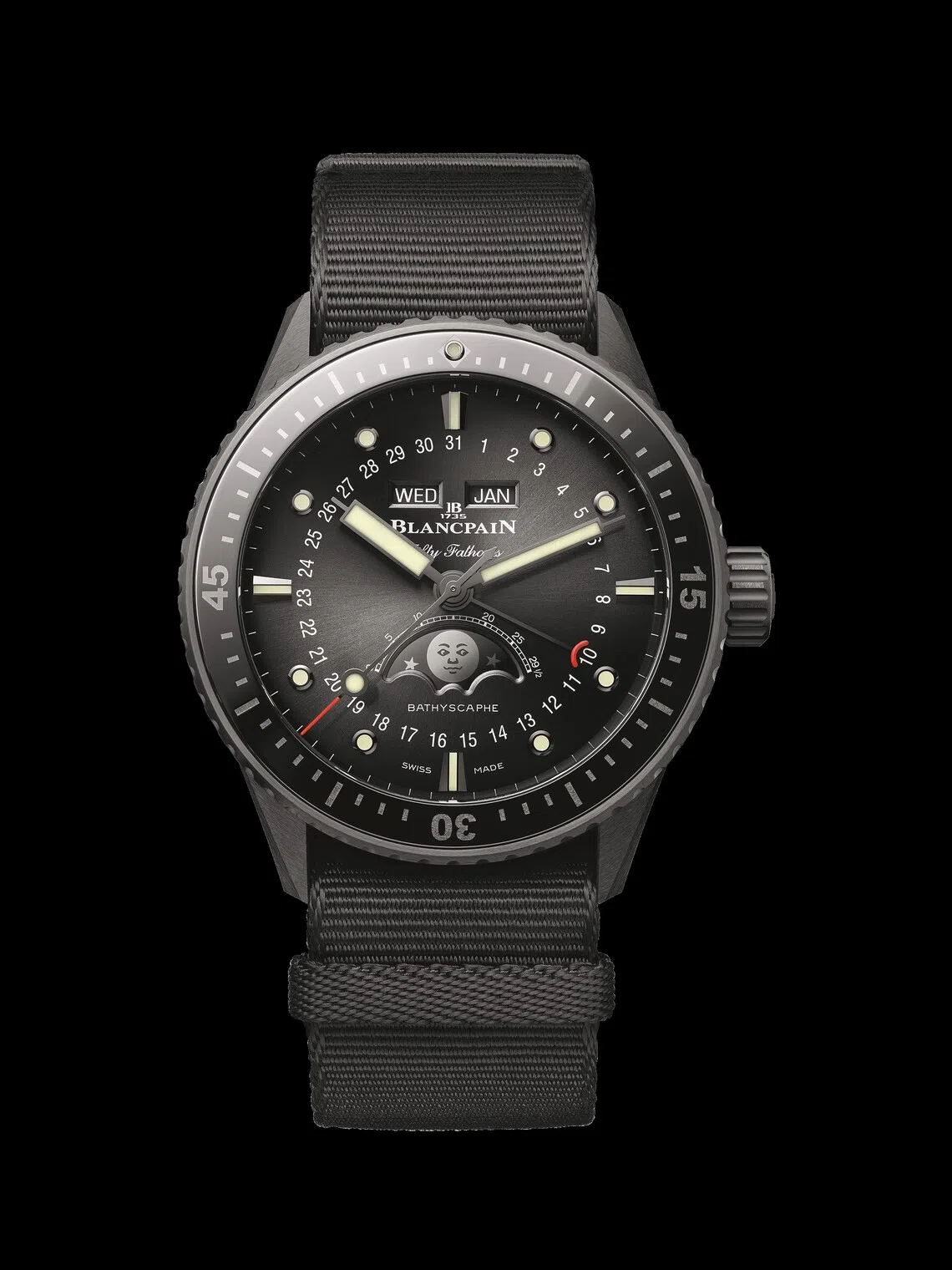 Blancpain debuts the Bathyscaphe Quantieme Complet Phases de Lune, which combines the manufacture’s legendary dive-watch heritage with a surprising twist of high elegance – an all-new high-tech ceramic bracelet