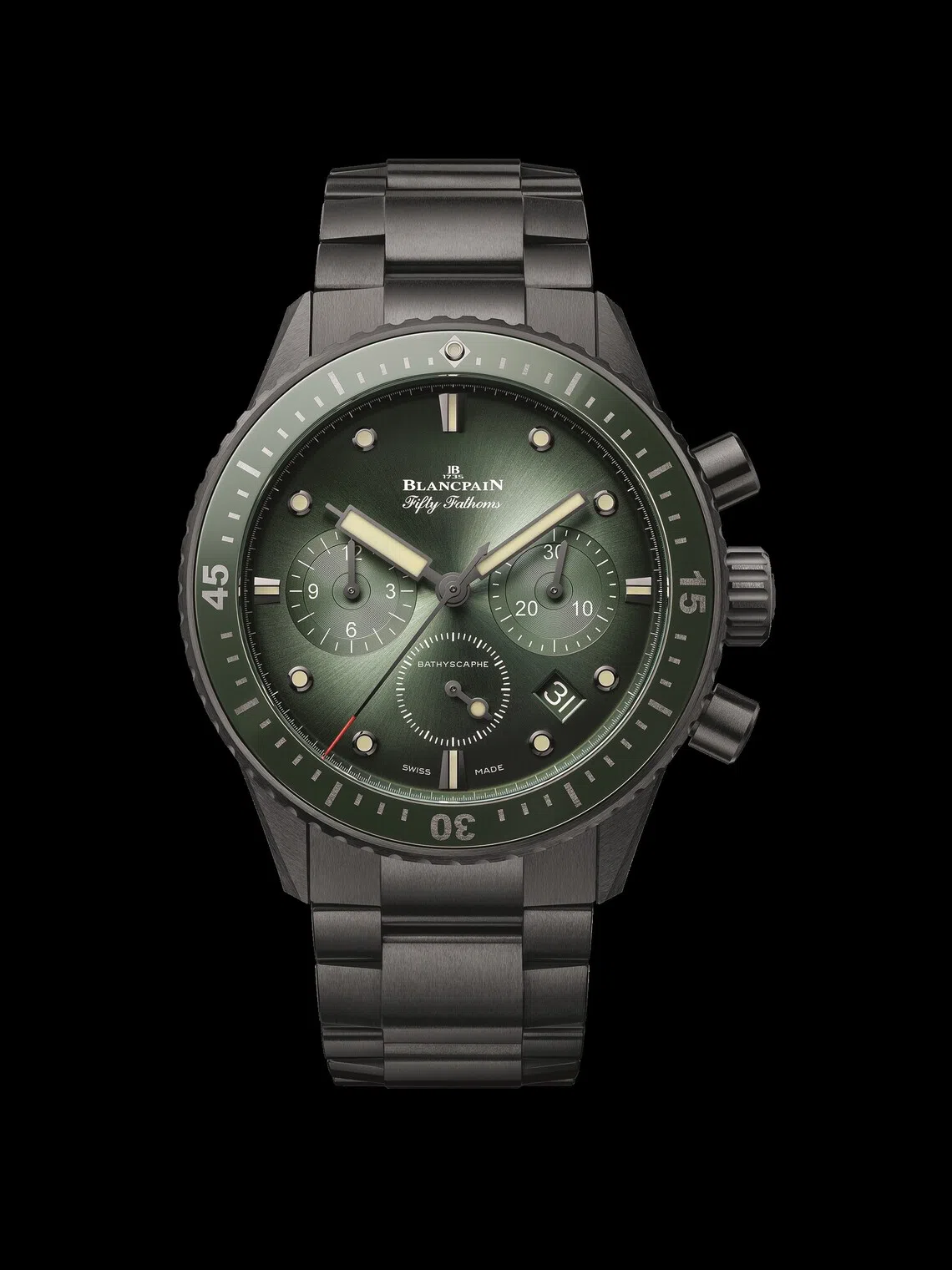 Moving into sportier territory, Blancpain expands its Chronographe Flyback collection with two 43.6 mm models featuring the new high-tech black ceramic bracelet, with a choice of either a sunburst green or black dial.