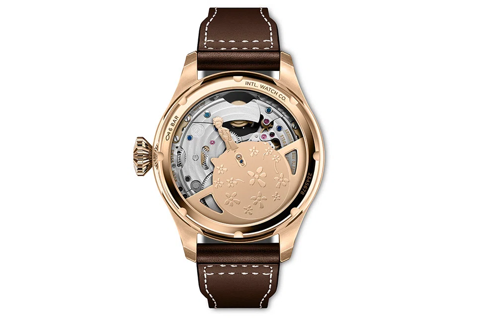 The Big Pilot's Watch TOP GUN Edition "Mojave Desert" also runs on an in-house self-winding movement with a power reserve of 7 days. What's more, it has a soft-iron inner cage that effectively protects the movement from the disruptive effects of magnetic fields. Engraved on the titanium case back is the TOP GUN logo. The watch is limited to 250 pieces a year.