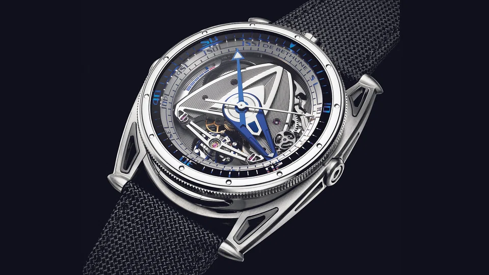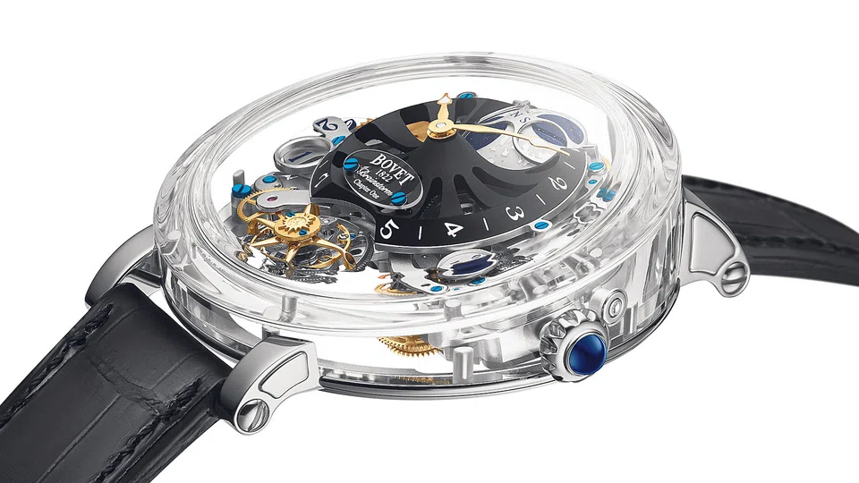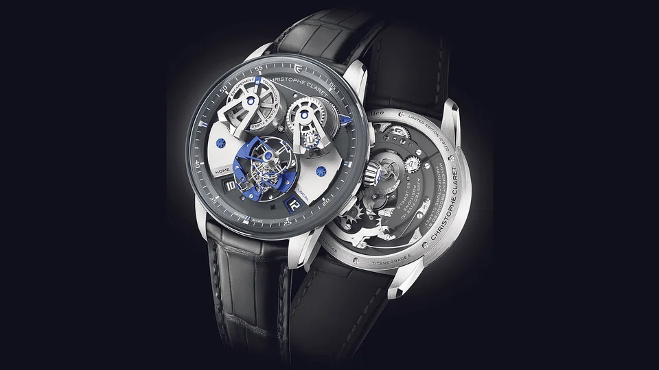 While visually attractive, the real beauty of this watch lies in its technically impressive heart. Within its 45.5mm diameter case (red gold or titanium), is a gravity-defying tourbillon combined, for the first time, with a long detent escapement and a cable-type fusee transmission system. The former is regarded as the ultimate in chronometric precision, but it's very sensitive to lateral knocks - hence lacking the sturdiness required for wearing on the wrist. Christophe Claret found a way around it by fitting an anti-pivot mechanism to work with a safety finger to prevent the detent from turning over. For greater efficiency, the double mainspring in the watch is connected to a cable-type fusee transmission system, instead of the traditional chain fusee. This increases as well as regulates the power reserve precisely. Angelico is limited to 10 pieces in red gold or titanium - and it has an extended warranty of five years.