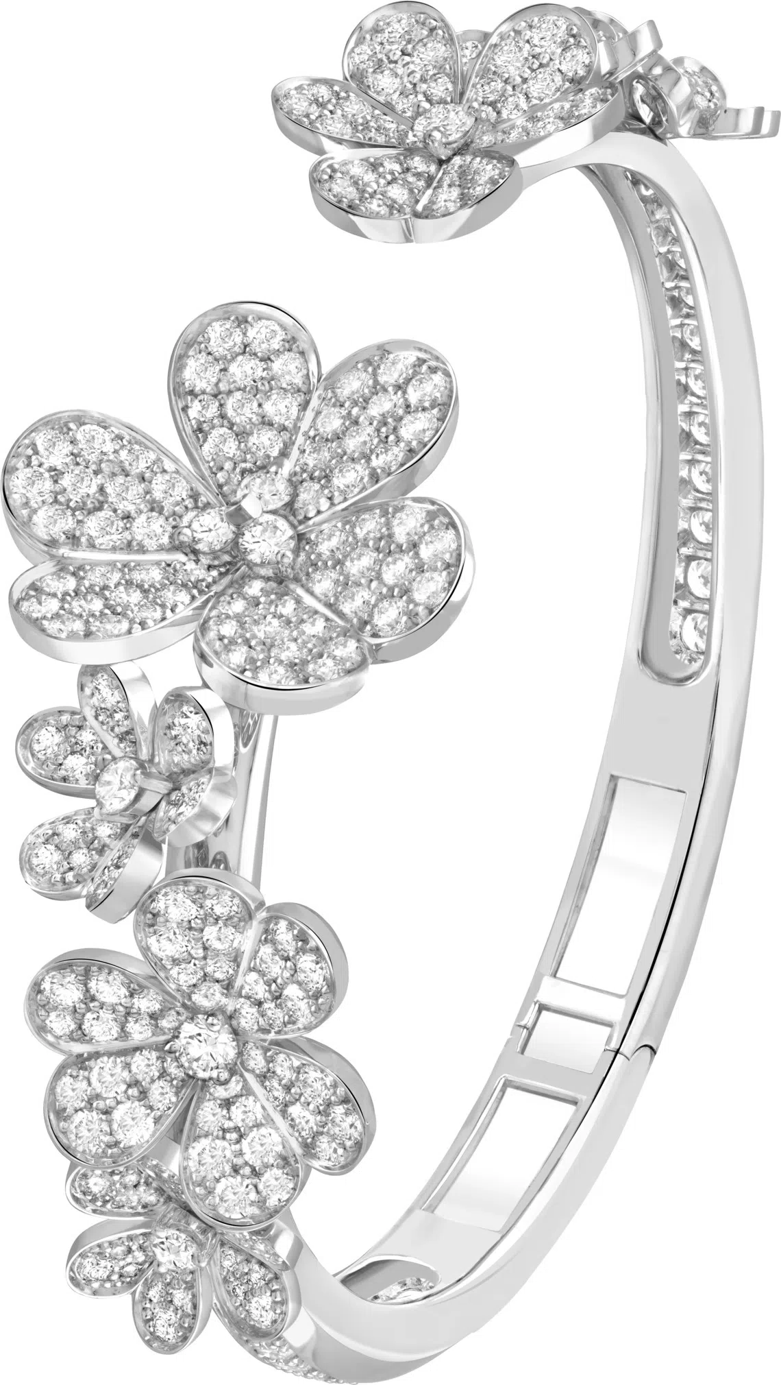 The first is a white gold, seven-flower bracelet studded with almost 300 diamonds. The gems run along much of the cuff bracelet and cover the graphic flowers which are arranged asymmetrically. The curved, heart-shaped petals are also tilted such that they resemble the liveliness of their natural counterparts.