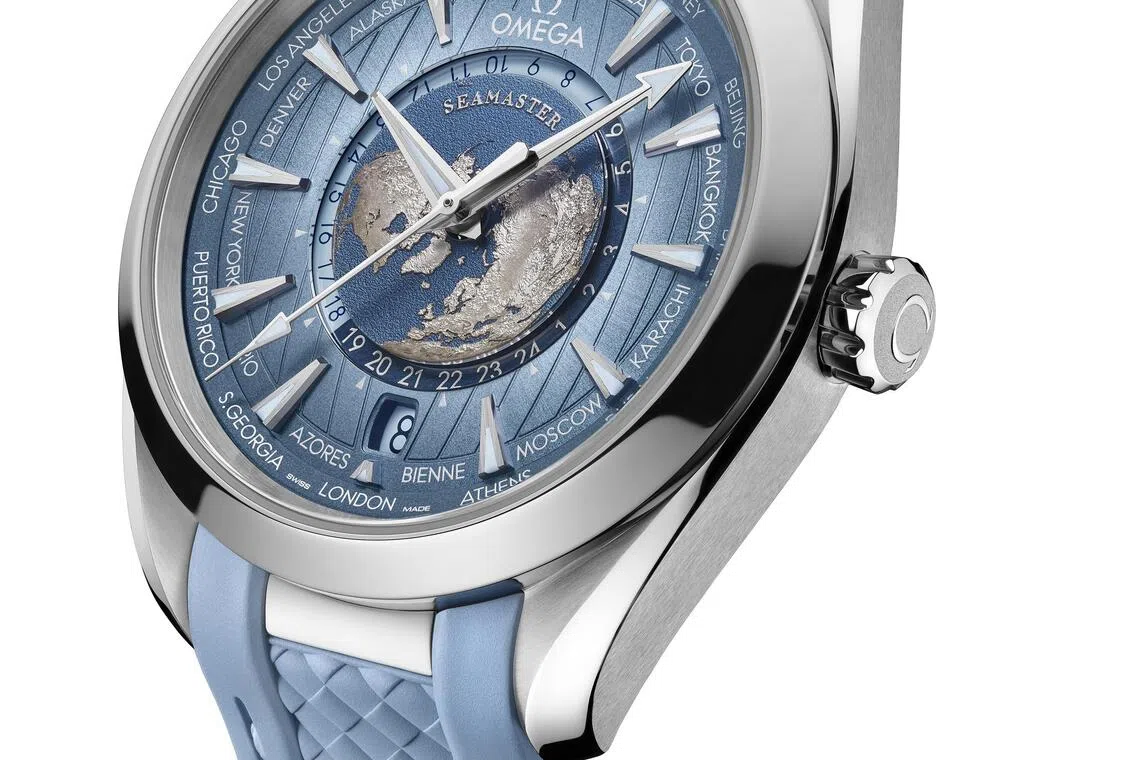 A travel timepiece which first appeared in 2017, the Worldtimer is capable of telling the time in 24 time zones, including day and night indications. The watch, water resistant to 150 metres, is also distinguished by a dial of extraordinary texture and colour, on which is a colourful view of Earth depicting a blue ocean and relief of the continents – all achieved by laser technology. The 43 mm stainless steel watch is available with a matching bracelet or blue rubber strap.