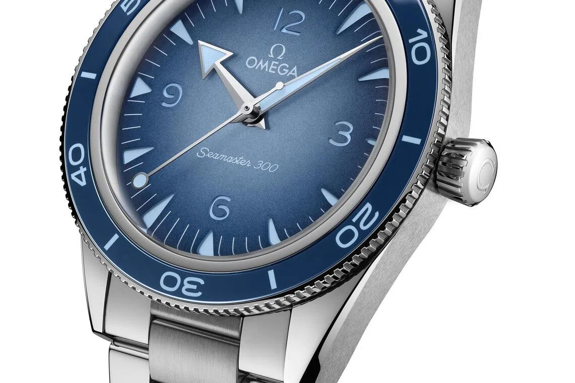 The Diver 300, made famous by celluloid spy James Bond, also has a water resistance of 300 metres. Yet, unlike the Seamaster 300, this model first released in 1993 is explicitly made for deep-sea adventurers. The watch has a helium escape valve and its blue ceramic bezel reveals a distinctive diving scale. The skeletonised hands and boldly raised indexes also bear the marks of a diving watch. These are set against a summer blue enamel dial and coated with Super-LumiNova that glows in the dark. At 42 mm, the Diver 300 is a wee bit bigger than the Seamaster 300 – and can be worn with a steel bracelet or blue rubber strap.