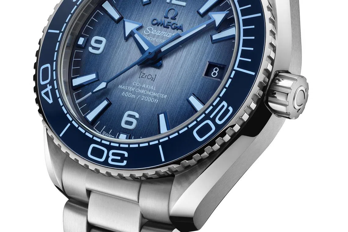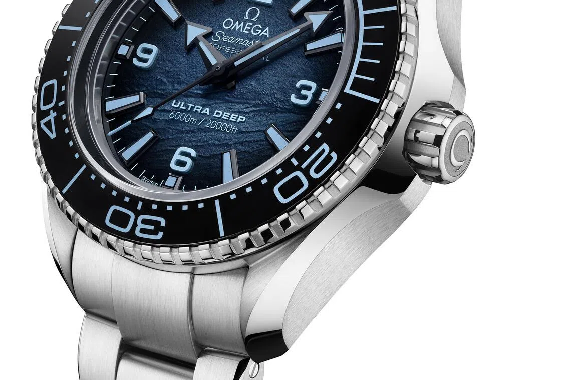 The watch’s iconic monobloc case is fitted with the famous screwed-in crown and the characteristic security pusher at 2 o’clock, which in this 2023 version sports a blue ceramic ring. A perforated blue rubber strap completes the 70s look. The new model is crafted in O-MEGASTEEL – a proprietary alloy five years in the making that’s twice as strong as conventional steel against stress. The dial is a sunlit summer blue and the sapphire-crystal bezel ring mirrors the chemically reinforced monolithic crystal used in earlier Ploprofs. This transparent crystal, varnished blue on the back, reveals a light blue diving scale beneath.