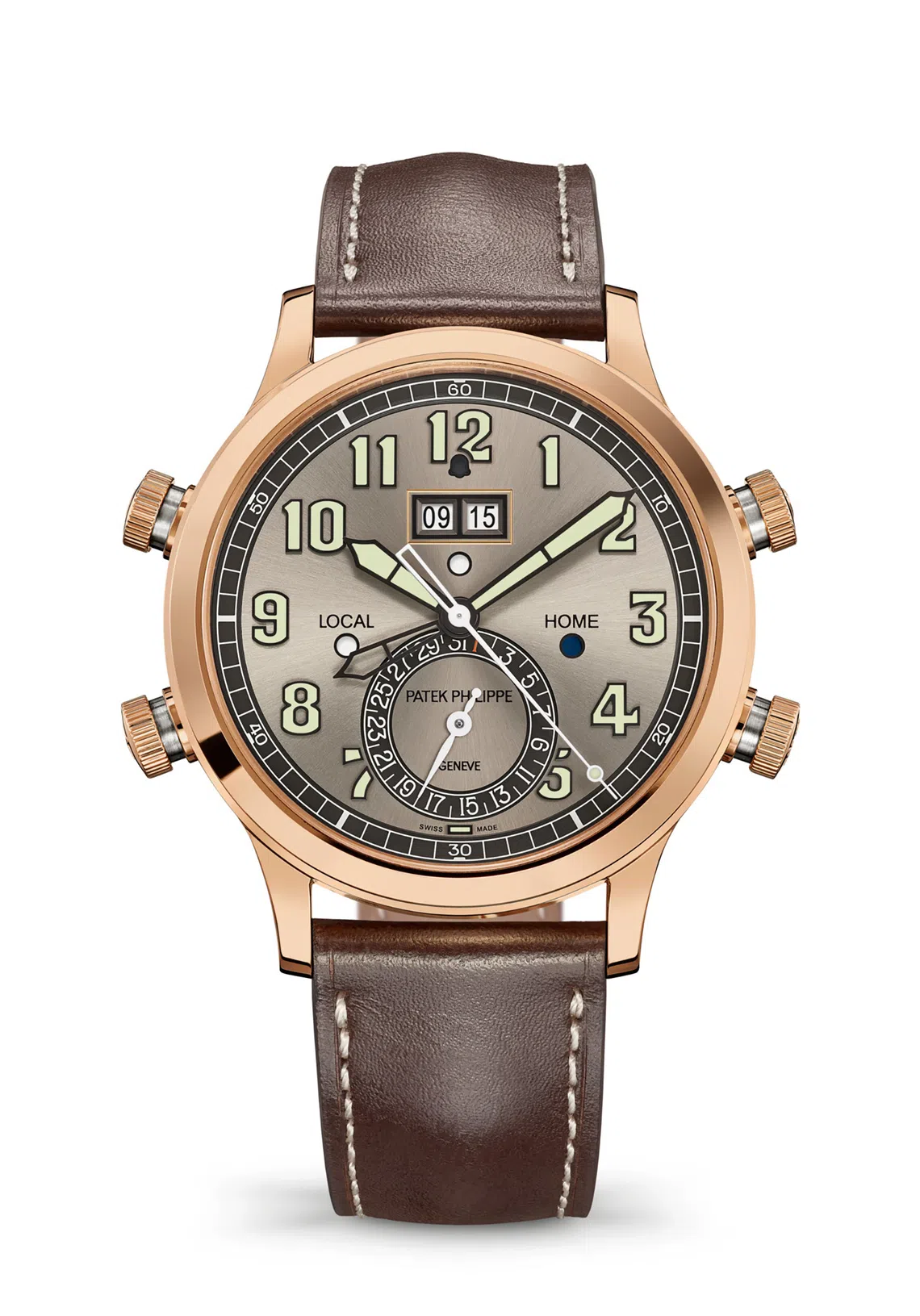 From Patek Philippe’s Pilot line comes a dual-time watch in rose gold. It features one central hour hand for home and another for local time, both easily adjusted by pressing two white gold pushers.