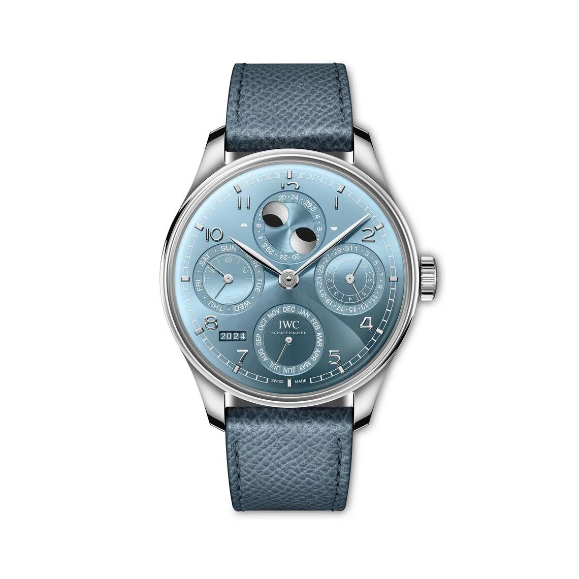 The gold Portofino Perpetual Calendar has a silver-plated dial with gold-plated hands and appliques. It is fitted with a blue strap made of calf leather.