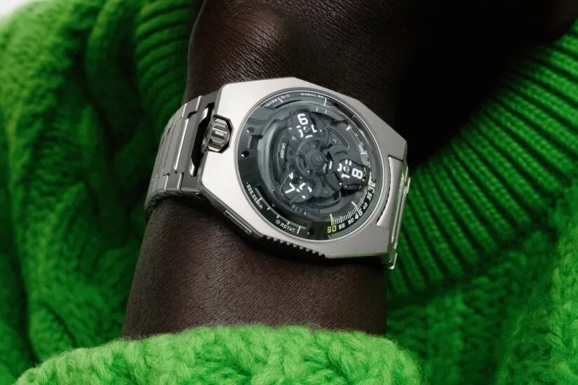 The UR-100V “Hunter Green” is a new chapter in Urwerk’s exploration of time, space and haute horlogerie, and is available exclusively at The Hour Glass for S$95,000.
