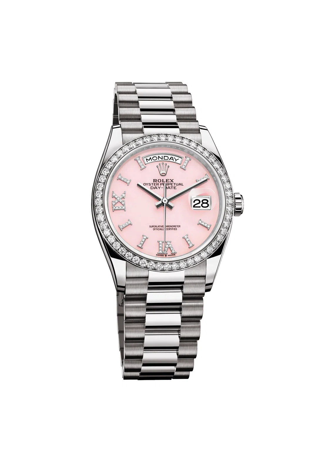 A pink opal dial is made all the more striking, thanks to the 32 diamonds set on the 18 ct gold hour markers with Roman VI and IX numerals – all framed in a 36 mm, 18 ct white gold case paired with the prestigious President bracelet in the same precious metal. The Day-Date is Rolex’s “ultimate prestige watch”. When it was launched in 1956, the Day-Date was the first watch to indicate the day of the week spelt out in full in 26 languages. Price: POA