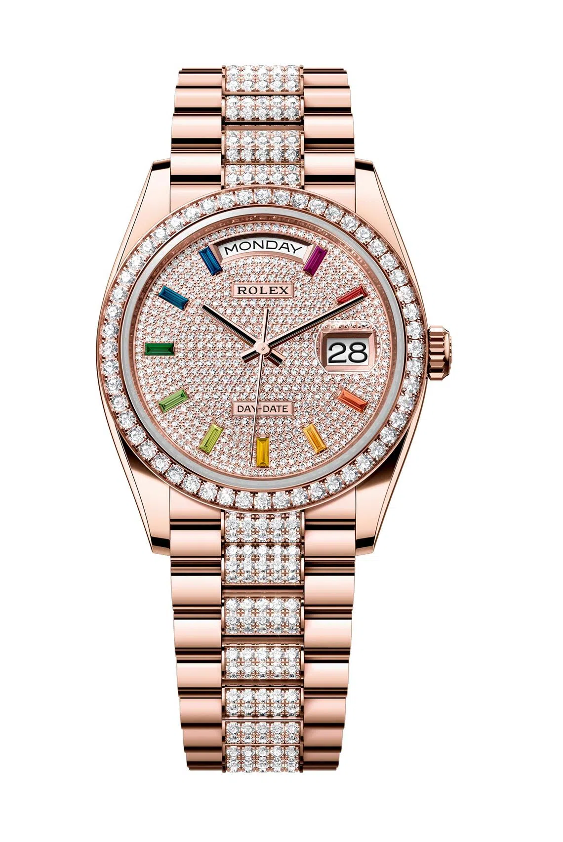 The dial of the watch, framed in a 36 mm Everose gold case, is also bedecked with 10 baguette-cut rainbow-coloured sapphire hour markers.