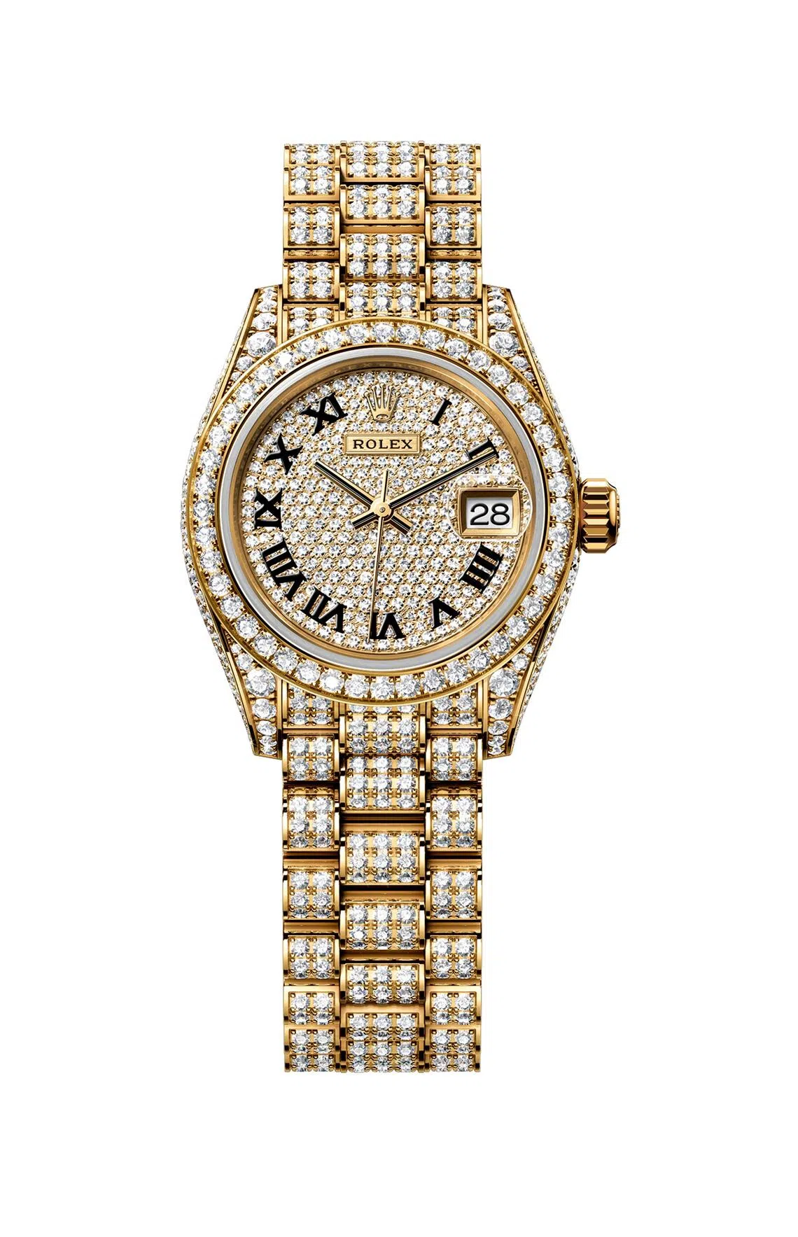 Paved with diamonds from the dial to the bracelet, this petite 18-ct yellow gold watch has 596 brilliant-cut gemstones on its three-piece link President bracelet, which is also in yellow gold.