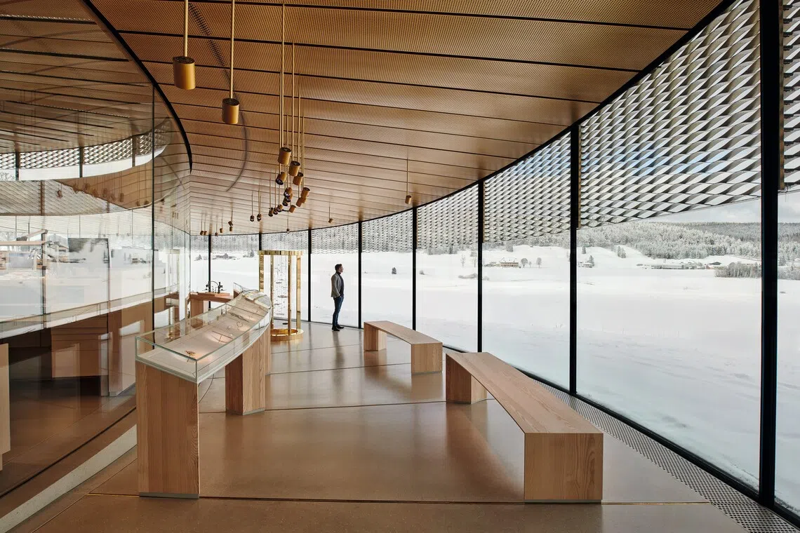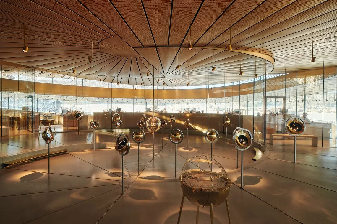 Instead of walls and columns, 108 load-bearing curved glass walls are used for the facade of the museum to allow for unobstructed views of the Vallee de Joux; while brass mesh help keep out the sunlight.