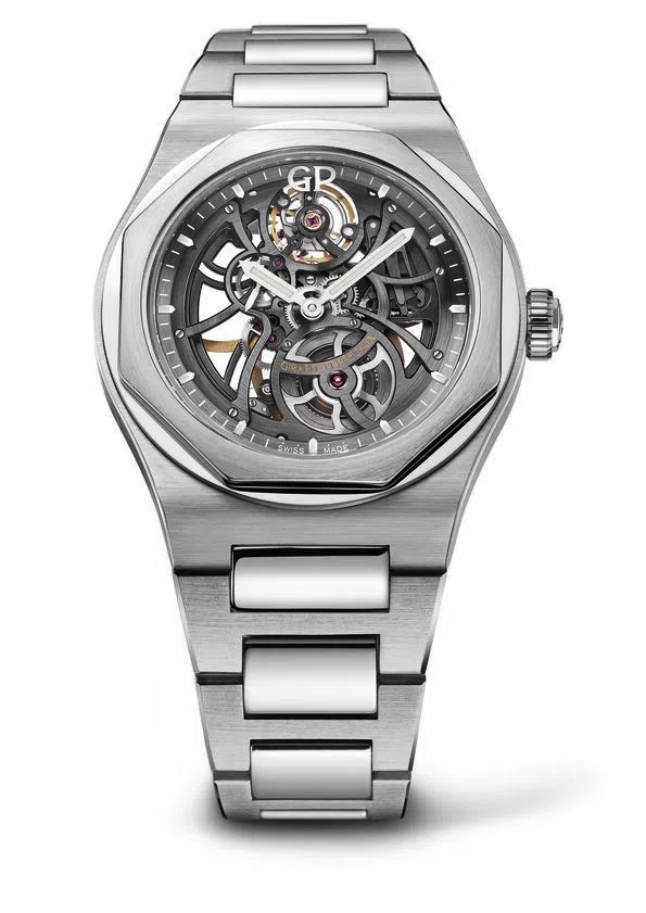 A striking piece in the collection is the Laureato Skeleton (S$60,600). It has a fine watchmaking movement adorned with chamfering that accentuates their outlines – all visible thanks to the open-worked satin-brushed dial handcrafted by Girard-Perregaux’s artisans.