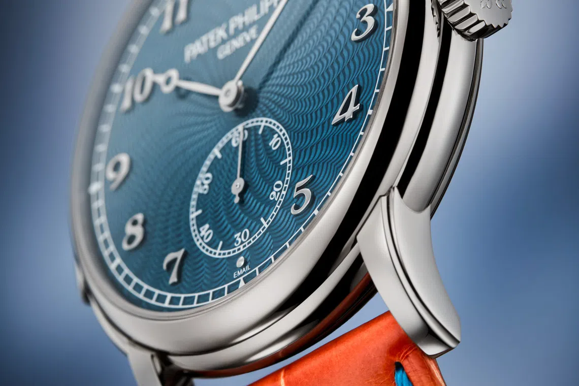The captivating timepiece also comes with two interchangeable straps in vivid hues: shiny peacock blue alligator leather with cream stitching and shiny orange alligator leather with blue stitching.