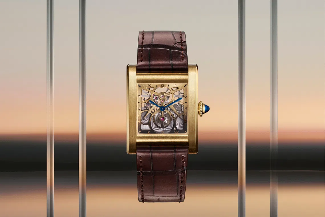 This year, the Tank Normale joins Cartier Prive, a collectors’ collection comprising unique and sought-after models of the past through limited-edition and numbered watches. A standout among the time-only variants is a skeletonised model incorporating a 24-hour complication marked by an open-worked sun and crescent moon.