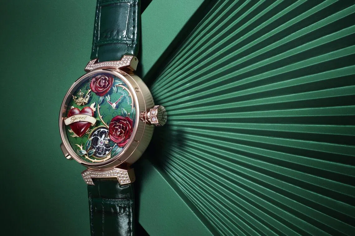 At nine o’clock a flaming heart, symbol of piety, is emblazoned with the word “SWEET” and crowned with a golden circlet of Louis Vuitton Monogram Flowers. The flowers also appear at the centre of two enamel roses, one at 12 o’clock and another at four o’clock.