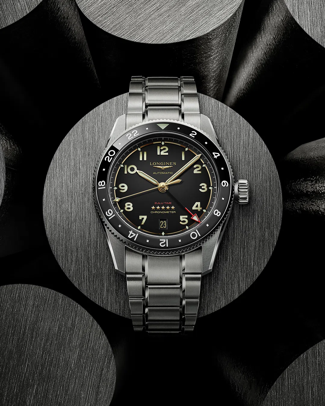 The Longines Spirit Zulu Time has been upgraded to a lightweight Grade 5 titanium model, enhancing its appeal as a robust yet elegant tool watch. This 39 mm timepiece features a bidirectional ceramic bezel with a 24-hour scale, split between matte and polished finishes, and an anthracite dial adorned with gold-plated hands and Super-LumiNova Arabic numerals.