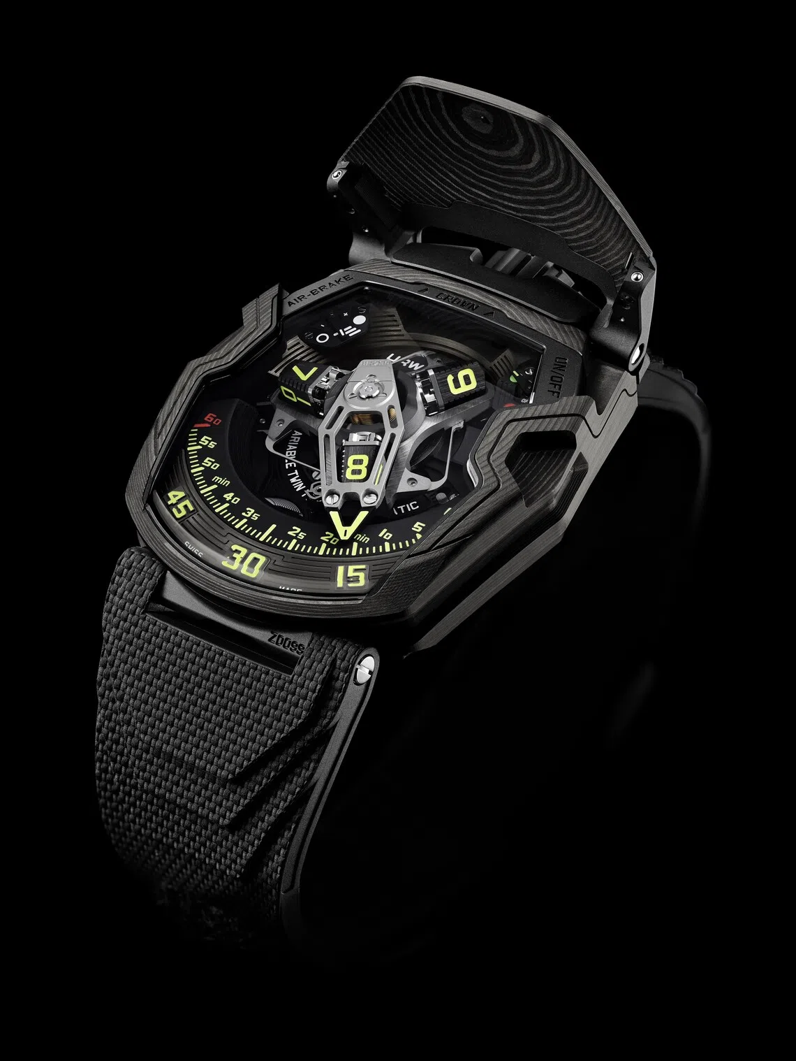 The UR-230 flaunts a complex half-hunter case in a trapeze shape with pronounced elongation, including a protective cover. The case is crafted from finely layered carbon, and its back is made of black DLC titanium.