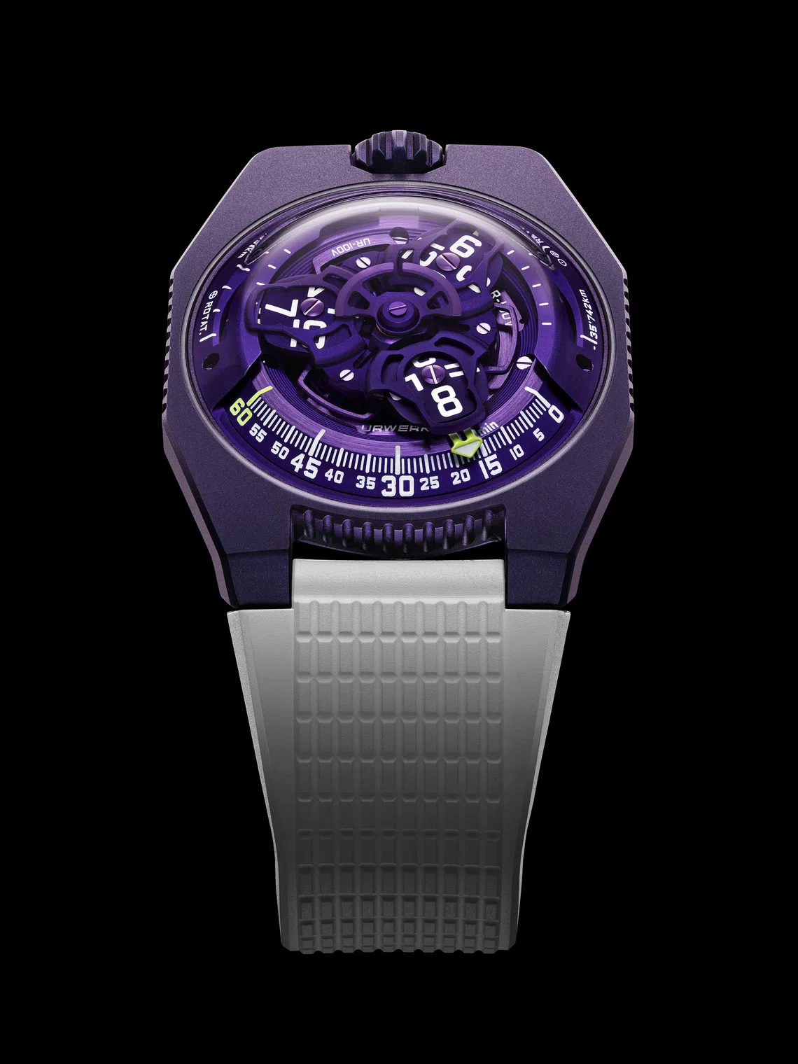 The colour spectrum visible to humans ranges from red to violet; anything beyond violet lies outside perceptible colour. The UR-100V Ultraviolet celebrates this boundary – this tipping point – from perceptive to imperceptible, says Urwerk’s artistic director Frei.