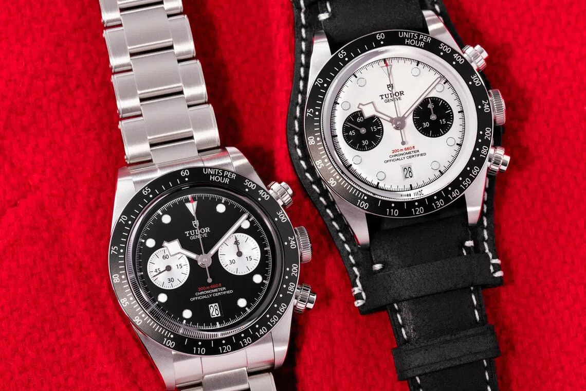A more contemporary Tudor chronograph is the Black Bay Chrono, which comes in stainless steel and yellow gold as well as full steel. Reflecting not just Tudor’s motorsports heritage, it harks back to 1970 when it rolled out its first chronograph. The Oysterdate, as it was called, was a sporty-chic timepiece with contrasting sub-counters. It also had the DNA of Tudor’s Black Bay diving watches, which originated in 1954.