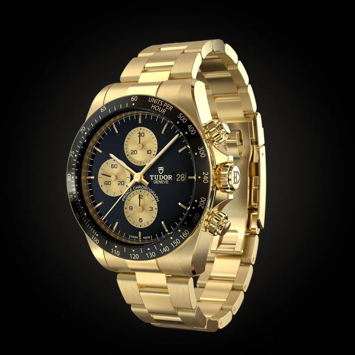 In its rebirth, the watch is fitted with a new prototype chronograph movement developed for the first time by Tudor from scratch. It comes in a 42 mm yellow gold case matched with a solid yellow gold bracelet – not the usual stainless steel or titanium associated with the robust tool watches Tudor is known for. The case of the revived chronograph frames a unique black lacquered dial with sunken gold counters, with “Prince Chronograph” printed above the 6 o’clock counter.