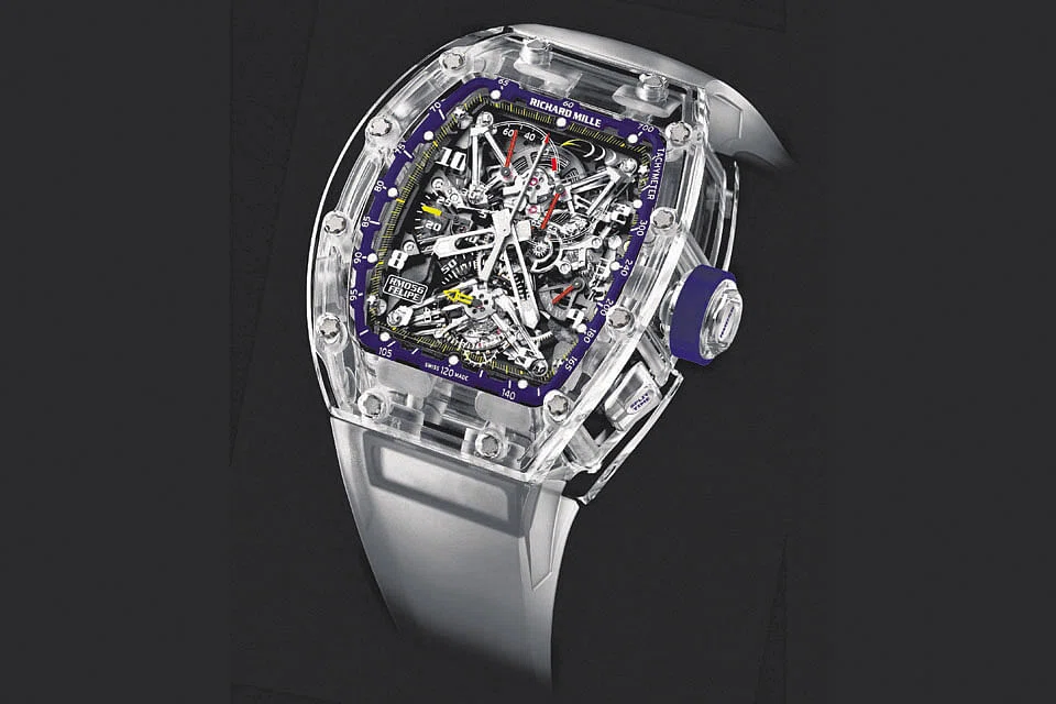 RM 056 Tourbillon is a tourbillon and split-seconds chronograph combo driven by a tourbillon movement made of titanium and housed in a case cut from a single block of sapphire. It's a limited edition of 10 pieces.