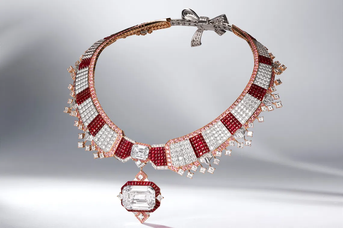 The collection began with an exceptional rough diamond — the 910-carat Lesotho Legend — the 5th largest in size and quality ever mined. Using 67 diamonds cut from this massive stone, the maison created 25 unique jewellery pieces, each using its complex Mystery Set signature technique that makes it possible to set rubies, sapphires or emeralds with no prong or other metal component visible.