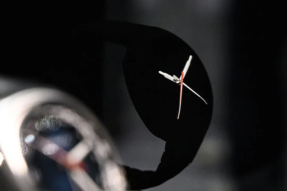 Perched against a black background, the watch, which is still in the concept stage, creates the illusion of a black hole, with only the coloured hands visible to the naked eye.