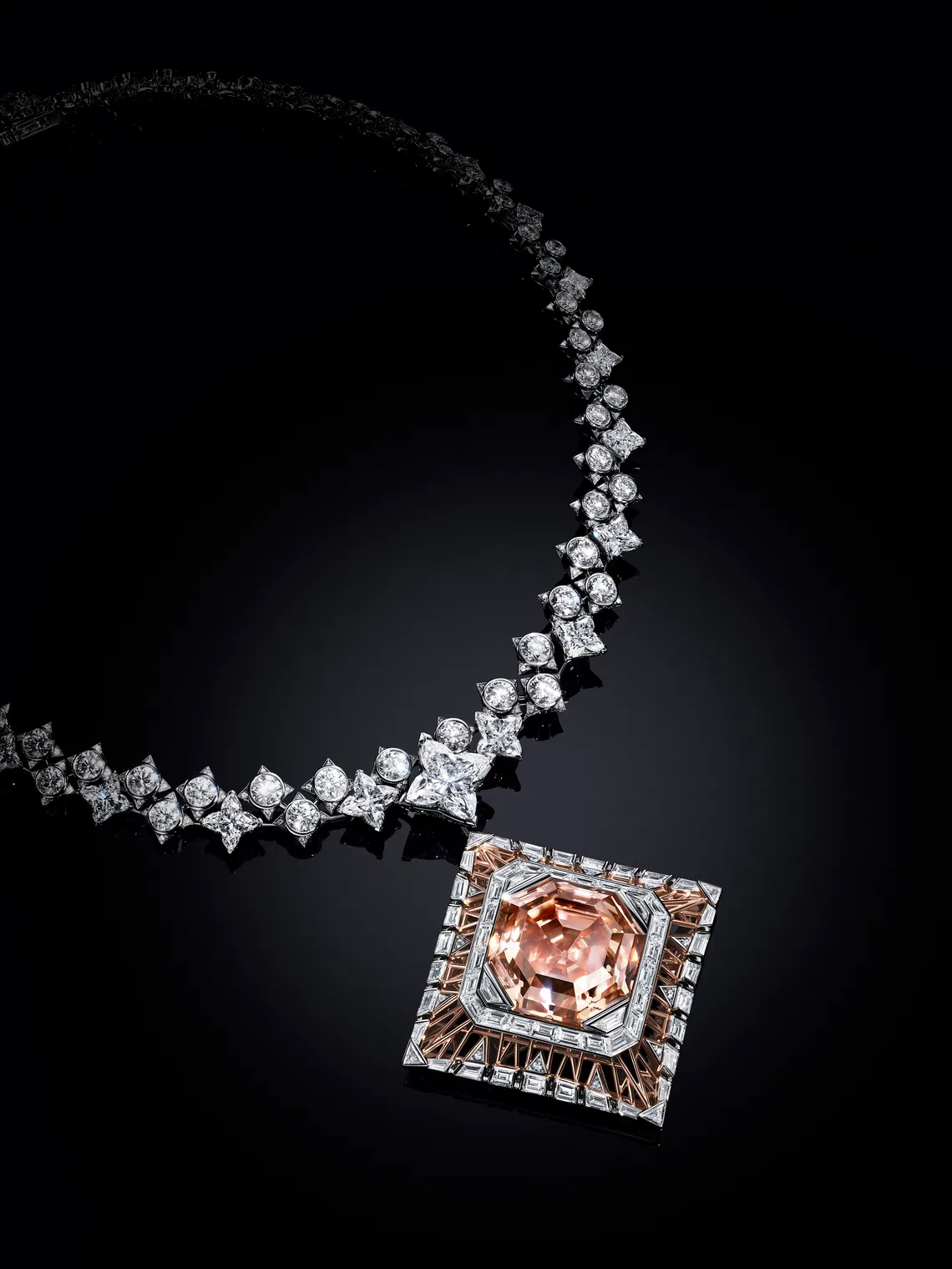 Then as France turned to industrialisation, freedom and exploration are represented in stylised interpretations of mechanisation and graphic repetitions. All this culminates in 1889 with the unveiling of the Eiffel Tower – a Parisian marvel and beacon of modernity – whose spirit Louis Vuitton captures in the very elegant Coeur de Paris necklace, where an incredible, pink-hued 56.23-carat diamond hangs like a medallion.
