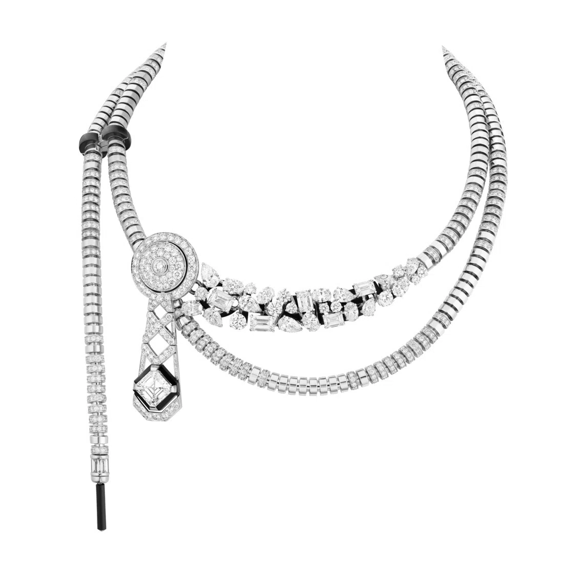 Unexpected elements abound in Haute Joaillerie Sport, which explores Mademoiselle Chanel’s affection for sporting aesthetics by reinterpreting sportswear and sport-related paraphernalia. Who would have thought that chevrons would be the key motif in a necklace that is the star of the collection? Or that drawstrings and snap hooks will be elevated to bejewelled status?