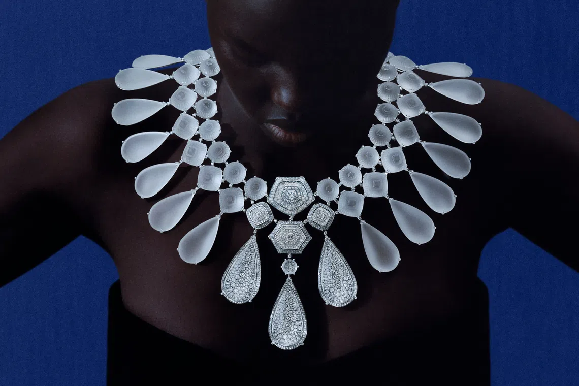 Its latest Carte Blanche 2024 High Jewellery Collection, Or Bleu, pushes creative boundaries with jewellery based on the naturalistic features of water. Like snapshots of nature, the liquid is captured in its rawest state – as a long cascade of diamonds coursing down the front of the body, or rippling across the decolletage. Iceland’s inky-black water is also translated into fluid, sculptural forms that appear in a cuff bracelet and ring, while its icebergs are conceived as an ethereal necklace and earrings.