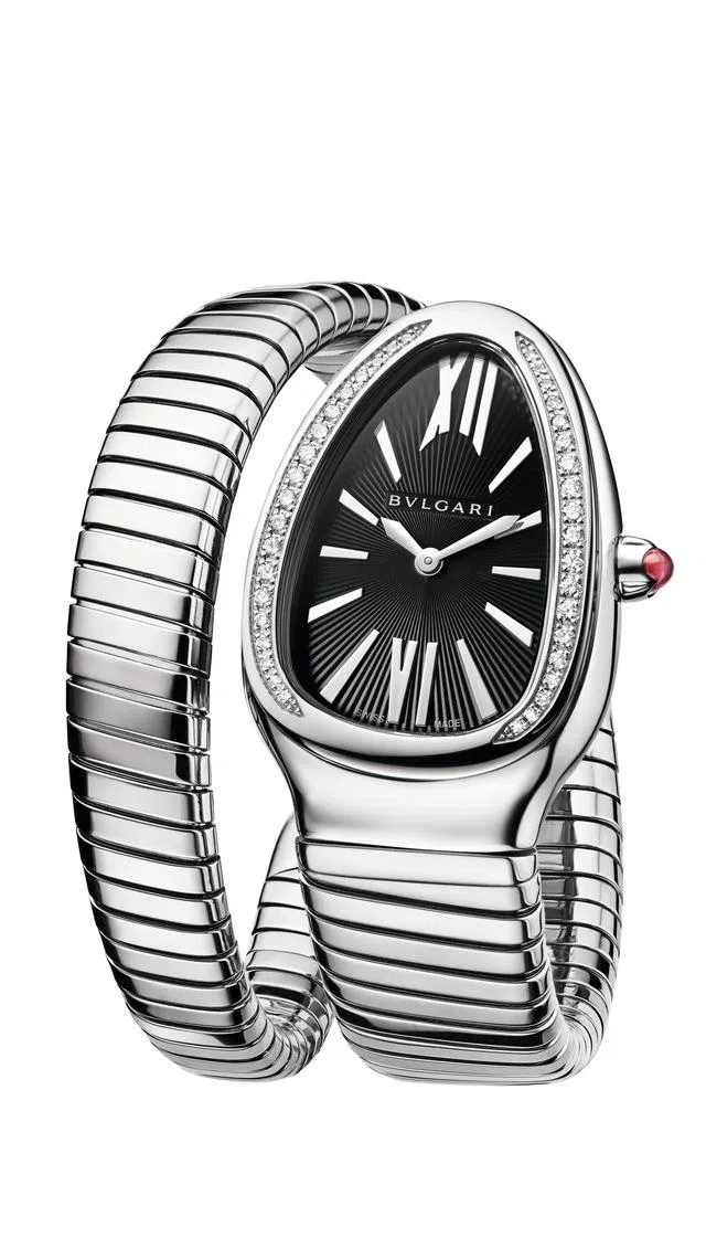 The Bvlgari signature timepiece, traditionally worn by women, features a black guilloche soleil dial, a cabochon-cut rubellite crown and the collection’s signature single-spiral bracelet.