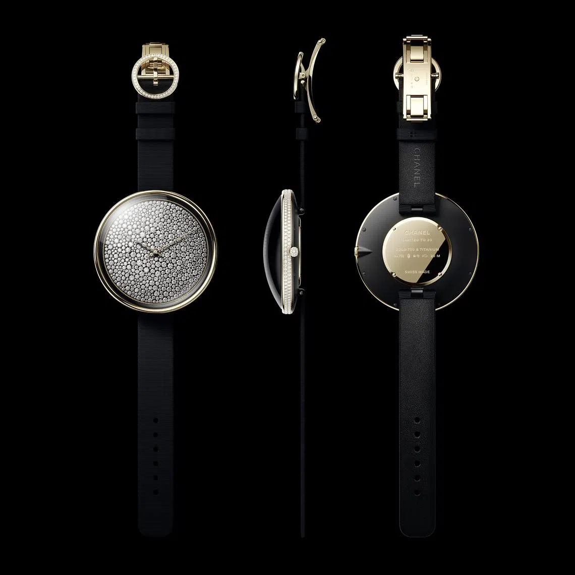While its architecture is simple, the dial is oversized for presence and impact and set with 650 brilliant-cut diamonds surrounded by mini pearls of yellow gold. The case, crown and buckle are also set with diamonds, while a black matte grosgrain bracelet completes the watch. This piece stands out for its pure and distinctive design and size.
